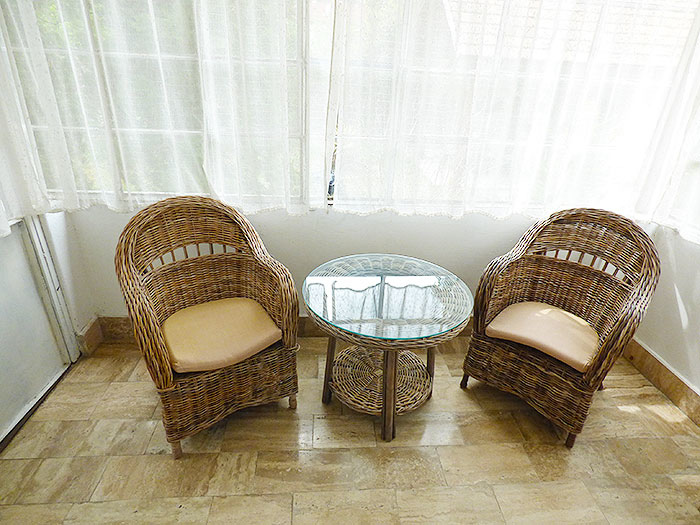 Wohnschlafzimmer mit TV/Sat, 1 Einzelzimmer, 1 Doppelzimmer, Bad und WC, Kaminofen, Terrasse. Separate Sommerküche mit Kaffeemaschine, Mikrowelle, Kühlschrank.