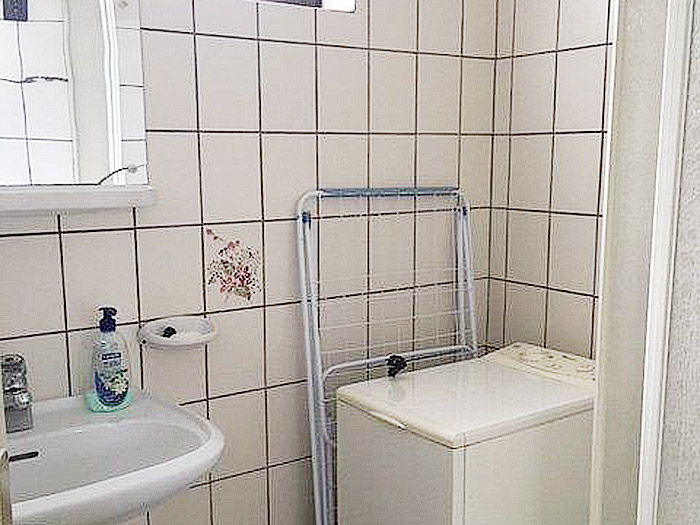 Eine alte Waschmaschine ist vorhanden.