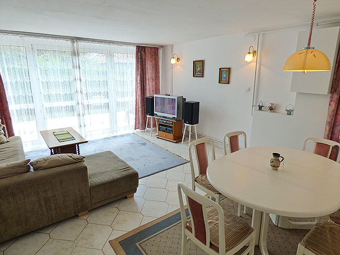 1.Ebene. Wohnzimmer mit TV/Sat und amerik. Küche, Mikrowelle, Kaffeemaschine, Kühlschrank, Esstisch, 1 Doppelzimmer, Wannenbad/WC,