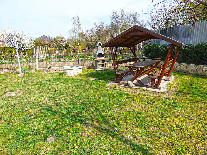 Garten mit Gartenmöbel und Grill, Parkplatz auf dem Grundstück,