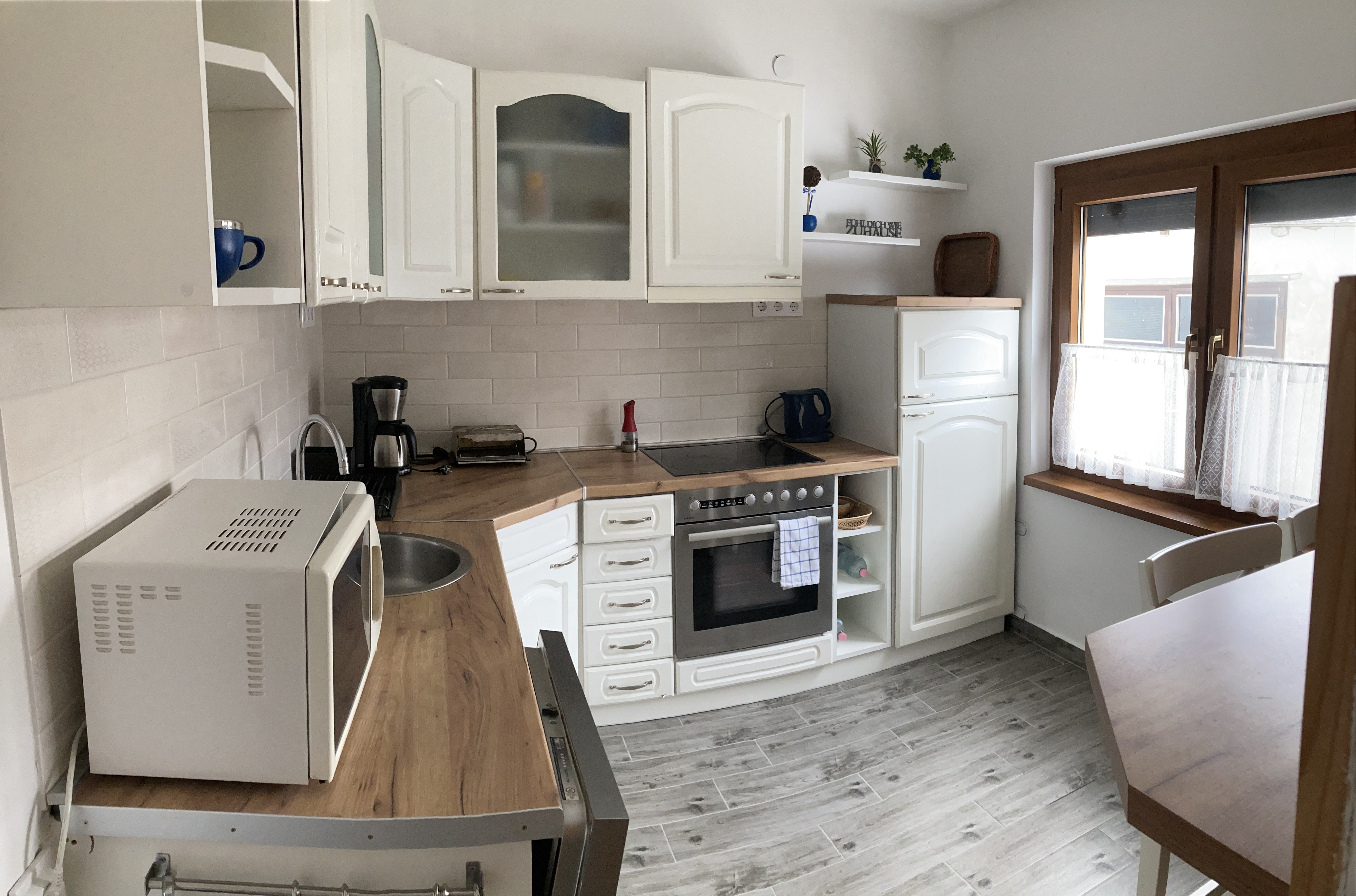 1.Ebene: Wohnzimmer/TV-Sat., Terrasse, 2 Doppelzimmer, Küche mit Seranherd, Geschirrspüler, Mikrowelle, Wasserkocher, Kaffeemachine, Kühlschrank, Bad mit Badewanne und WC.