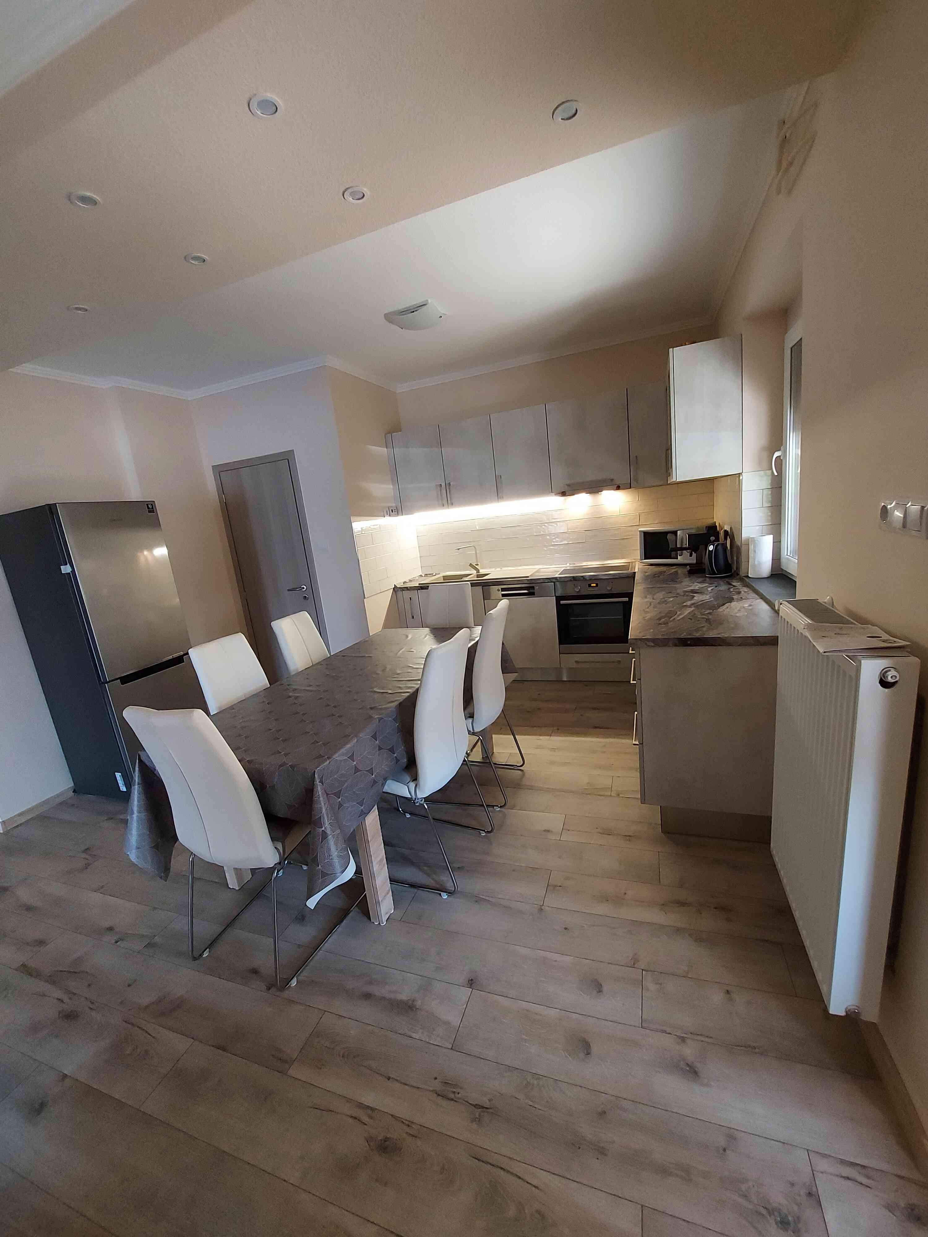 Küche mit Esstisch, Herdplatten, Kaffeemaschine, Kühlschrank, Mikrowelle, Bad/WC,