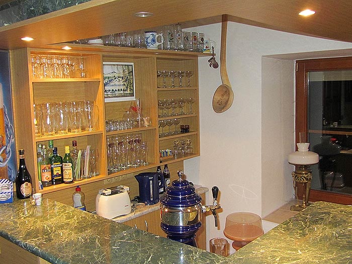 Erdgeschoss: 1.Ebene: separater Eingang, Wohnraum mit 2-er Herdplatten, Kühlschrank, Mikrowelle, Kaffeemaschine, Wasserkocher, Sitzmöglichkeiten und kl. Kaminofen, (Holz vorhanden), inkl. Bar und TV/Sat. Gartenmöbel mit Grill, kl. Haustier bis 5kg für 4€/Tag erlaubt.