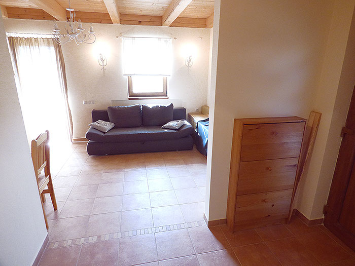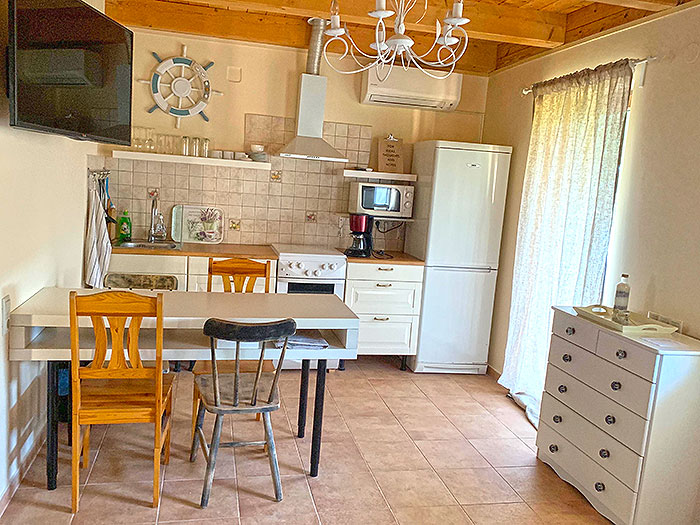 Wohnschlafzimmer für 2 Personen mit TV-Sat. und amerik. Küche, Kaffeemaschine, Mikrowelle, Eßtisch, Kühlschrank, Herd mit Backofen, 1 Doppelzimmer, Bad und WC, schöne Südterrasse,