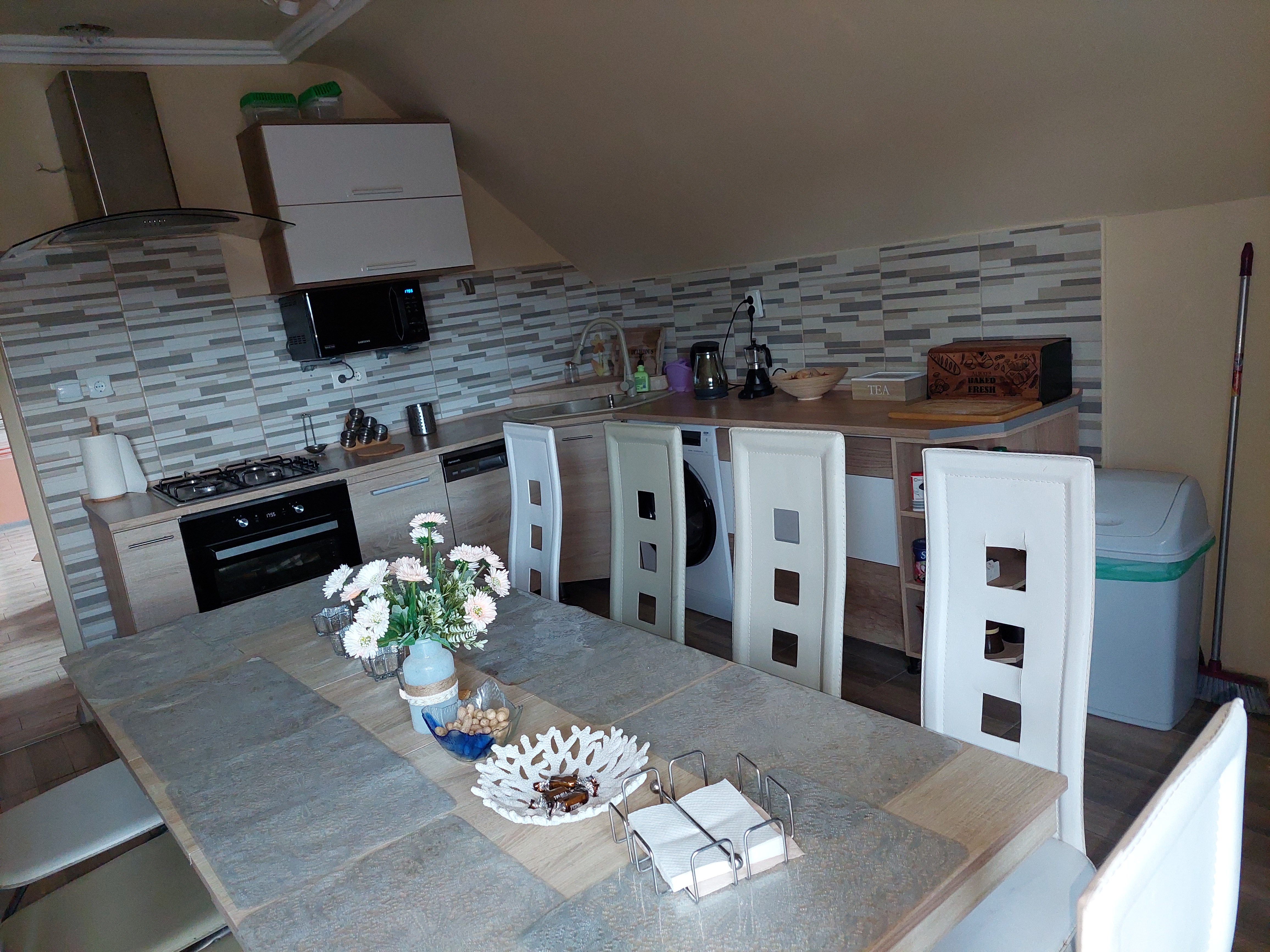 2.Ebene: separater Eingang: für 9 Personen große Küche, Eßtisch, Kaffeemaschine, Mikrowelle, Kühlschrank, Herdplatten, Waschmaschine, Geschirrspüler, 1 Doppelzimmer mit Terrasse,