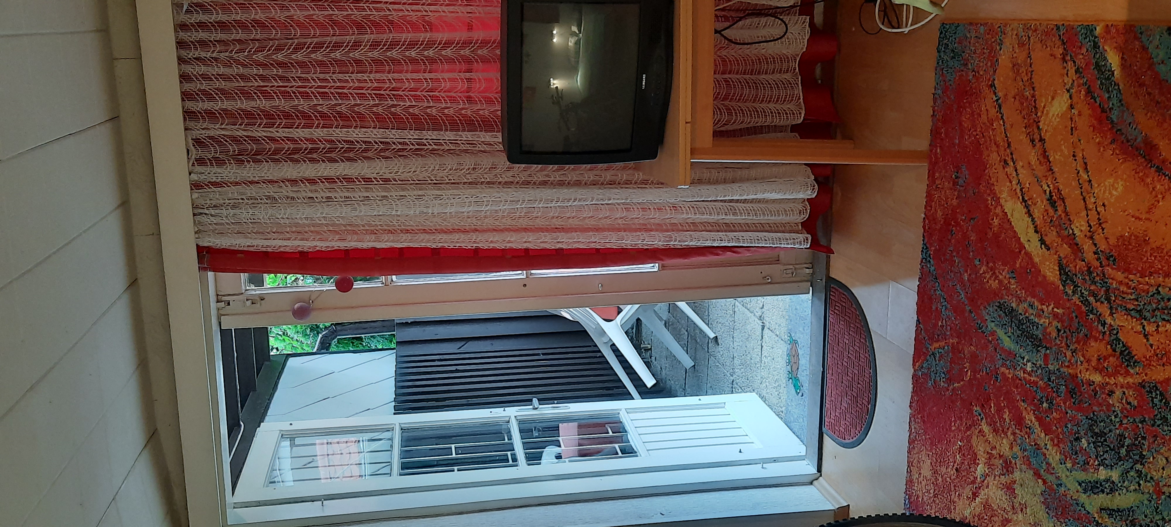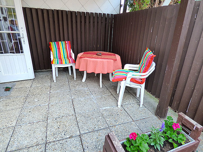seitlicher Eingang(rechts): Wohnschlafzimmer für 2 Personen mit TV/Sat., kleine Kochmöglichkeit, Kaffeemaschine, Mikrowelle, Kühlschrank, Herdplatte, Terrasse, Bad/WC, Garten mit Gartenmöbel, Grill, Haustier erlaubt (6,-€ pro Tag).///Klimaanlage optional. 5.-/ Tag