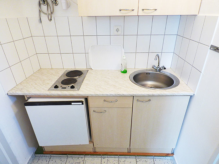 Bad/WC, kleine Küche mit Kaffeemaschine, Kühlschrank, Herdplatten,