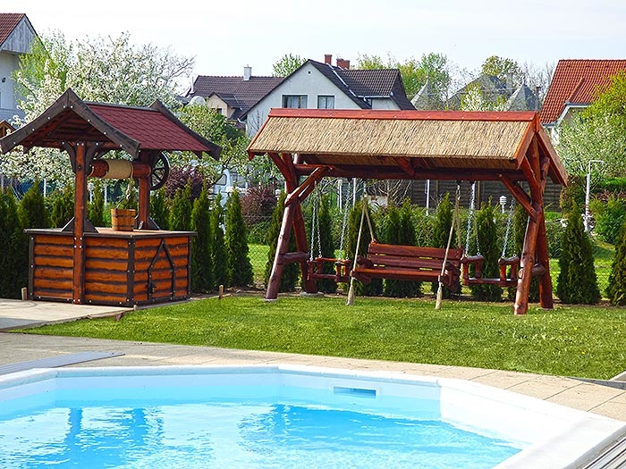 Garten mit Gartenmöbel, Swimmingpool (4,5x10m), Grill, Spielplatz, Lagerfeuerplatz, Schaukel, Parkplatz auf dem Grundstück,