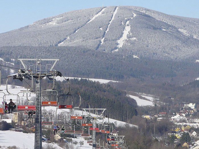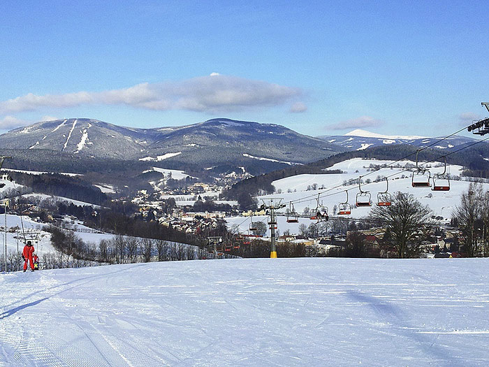 MLADÉ BUKY (auf Deutsch: Jungbuch) liegt im Tal des Úpa-Flusses und wurde Mitte des 13. Jahrhunderts von deutschen Kolonisten gegründet. Bis zur Vertreibung der Sudetendeutschen im Jahre 1945 hieß der Ort Jungbuch. Heute ist der Ort mit 3900 Einwohnern ein Fremdenverkehrsort und zählt im Winter zu den beliebtesten Skigebieten der Region. Zahlreiche Sessellifte, Schlepplifte, eine Bahnstation und das neu errichtete Ski&Golf Resort "Mlade Buky" bieten optimale Wintersportmöglichkeiten. Von hier aus hat man einen wunderschönen Panoramablick auf das Riesengebirge und kann sowohl den Schwarzen Berg (Cerni Hora) als auch die Schneekoppe sehen(Pec pod Snezkou), die mit 1602m der höchste Berg des Riesengebirges und auch Tschechiens ist. Zum Ski&Golf Resort zählt auch ein Hotel und ein exklusives Restaurant, das erst 2009 fertiggestellt wurde. Neben allen wichtigen Wintersportleistungen steht den Urlaubsgästen auch ein Pendelbus zur Verfügung, der regelmäßig zwischen Mlade Buky und Trutnov verkehrt. Trutnov ist die "Hauptstadt" des Riesengebirges und wird vor allem wegen der guten Einkaufsmöglichkeiten und der Sehenswürdigkeiten im historischen Stadtzentrum besucht. Der Wintersportort Janské Lázne mit der einzigen Kabienenbahn vom CZ-Riesengebirge ist auch nur 5km entfernt. GOLFINFO: Vorhanden sind ein überdachter Trainingsabschlagplatz mit 11 Boxen und einem Sechs-Loch-Übungsplatz sowie zwei Plätzen mit neun und 18 Löchern. Die Anlage gehört wegen ihres einzigartigen Riesengebirgspanoramas zu den schönsten in ganz Europa. Fakten zu Mlade Buky Wintersportort: Saison: Dezember-März Höhe: 550-670 m Kunstschnee: ja Nachtski: ja Lifte und Seilbahnen Mlade Buky Sessellift: 1 Schlepplift: 8 Kapazität: 7700 Personen / Stunde Pisten: 10 (5 km ges) davon mittel: [rote Pisten Skigebiet Mlade Buky] 1 leicht: [blaue Pisten Skigebiet Mlade Buky] 9 Längste Piste: 0,8 km Extras: Loipe/Crosscountry: 15 km
