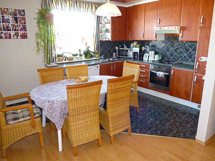 1.Ebene: Terrasse, großes Wohnzimmer mit merik. Küche mit Eßtisch, Kaffeemaschine, Mikrowelle, Kühlschrank, Herd mit Backofen, Bad, ein extra WC,
