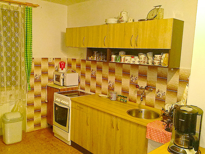 2 Doppelzimmer, Terrasse, einfache Küche mit Kaffemaschine, Mikrowelle, Herd mit Backofen, Kühlschrank mit Eisfach, Esstisch,