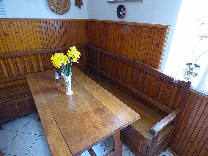 1. Ebene(unten): großes Wohnzimmer mit Kamin und TV-Sat. plus Klavier, Terrasse, Küche mit Esstisch, Kühlschrank, Kaffeemaschine, Herd mit Backofen, Mikrowelle, extra WC und eine zweite Terrasse, Waschmaschine